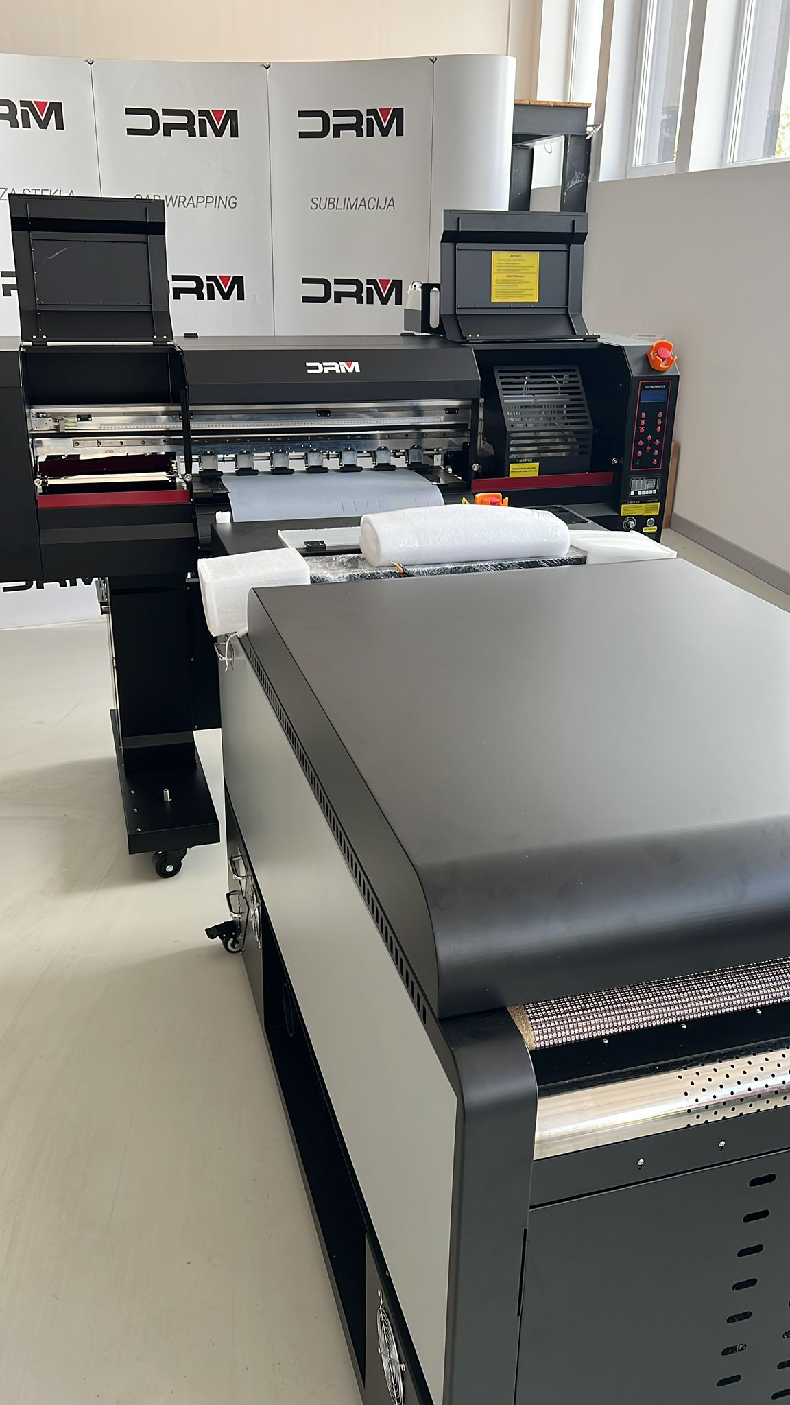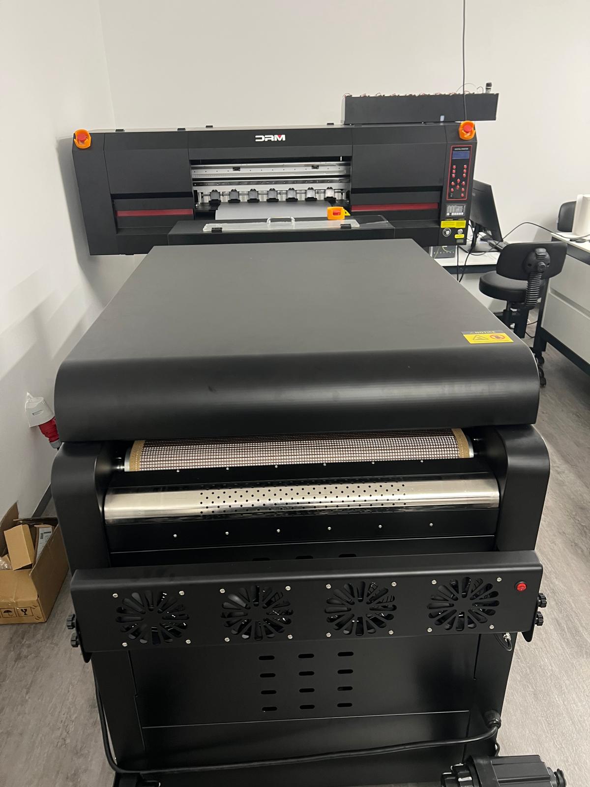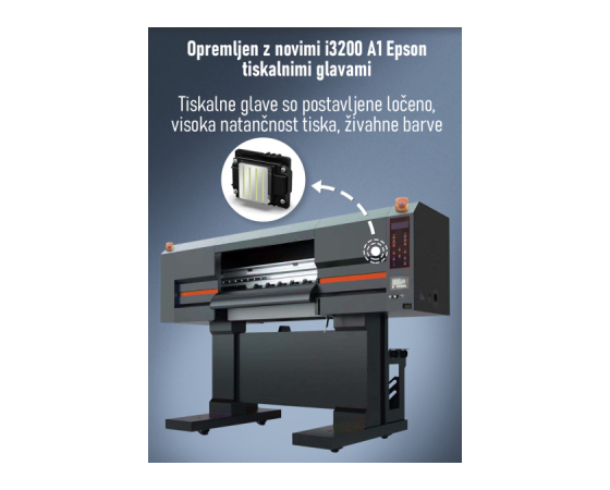 DTF tiskalnik 60 cm z 5× EPSON I3200 glavami. Tiskalnik ima vgrajeno avtomatsko polnjenje čistila v posodice za glavo, tako da praktično ne potrebujete osebe, ki bi vsakodnevno čistila tiskalnik. Ima tudi kroženje bele barve za bolj stabilen in zanesljiv tisk ter avtomatsko odmotavanje folije za enakomeren potek dela.